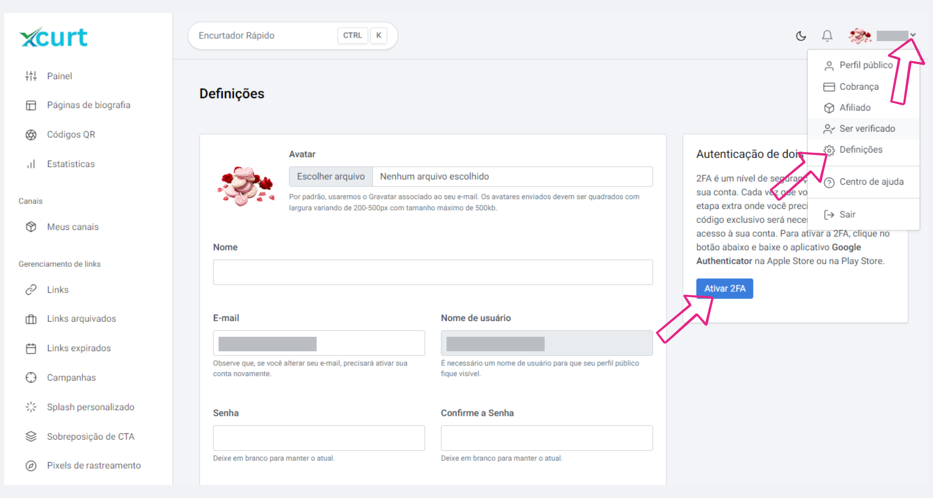 Para ativar a 2FA em sua conta em xcurt encurtador de links, primeiro clique no canto superior direito abrirá uma caixa de opções, clique em definições a opção de 2FA estará pronta para ser ativado seguindo o passo a passo de camadas de proteção para sua conta segura.
